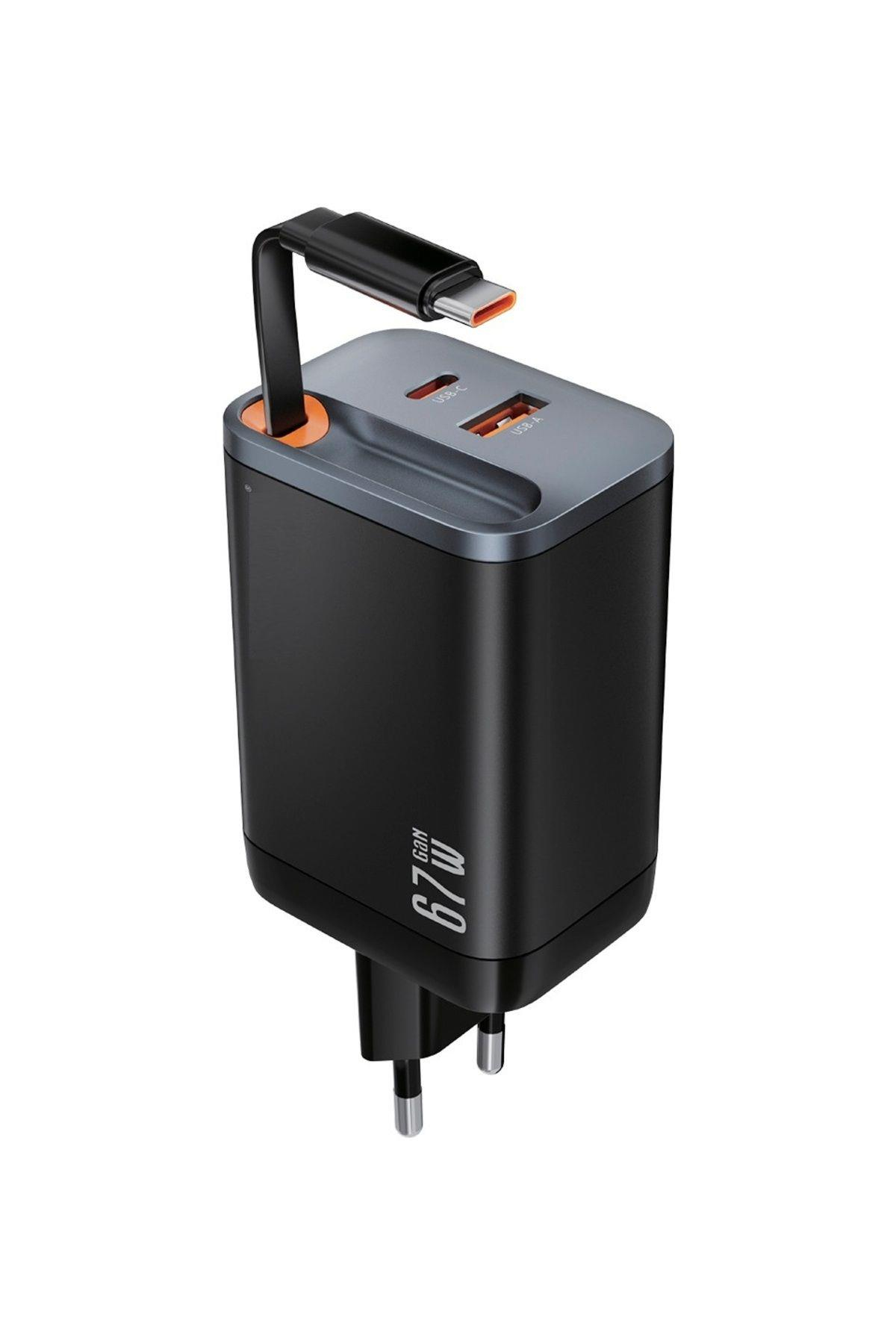 67W Gan Hızlı Şarj Adaptörü | Dahili Retractable Usb-C Kablo + Usb-A Çıkışı | Telefon, Tablet ve Laptop Uyumlu